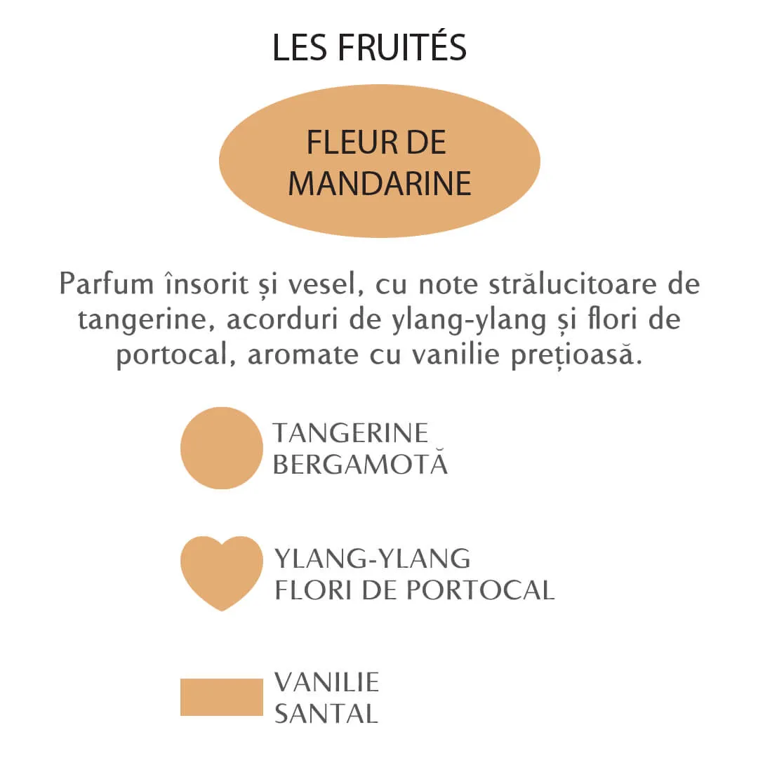 Dacă povestea parfumată de mai sus te-a cucerit, te invităm să cunoști și celelalte produse Fleur de Mandarine: apă parfumată pentru corp și părbalsam-cremă pentru mâini, gel parfumat pentru duș, săpun mătăsos pentru mâini.